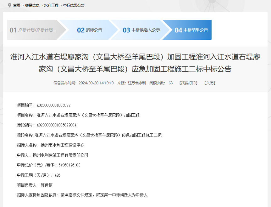 喜報(bào)!公司中標(biāo)淮河入江水道右堤廖家溝應(yīng)急加固工程施工二標(biāo)項(xiàng)目